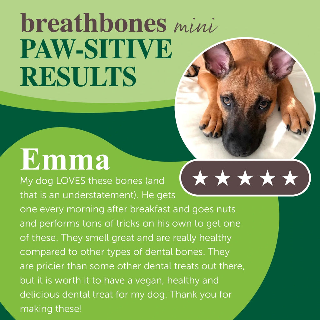 Our Breath bones are made with sweet potato, chia seed, broccoli, and parsley to help reduce inflammation and improve dental health. While the pup chews it also helps to remove plaque build up from the teeth.