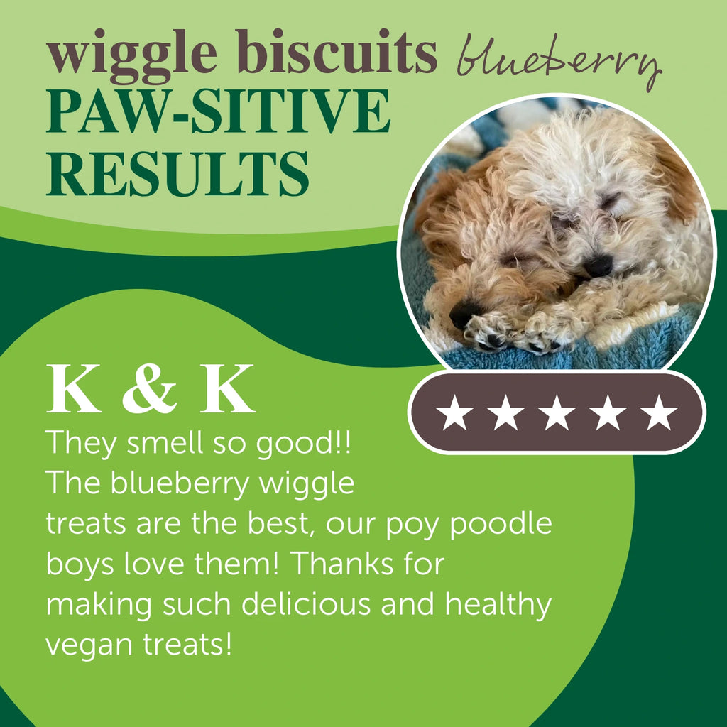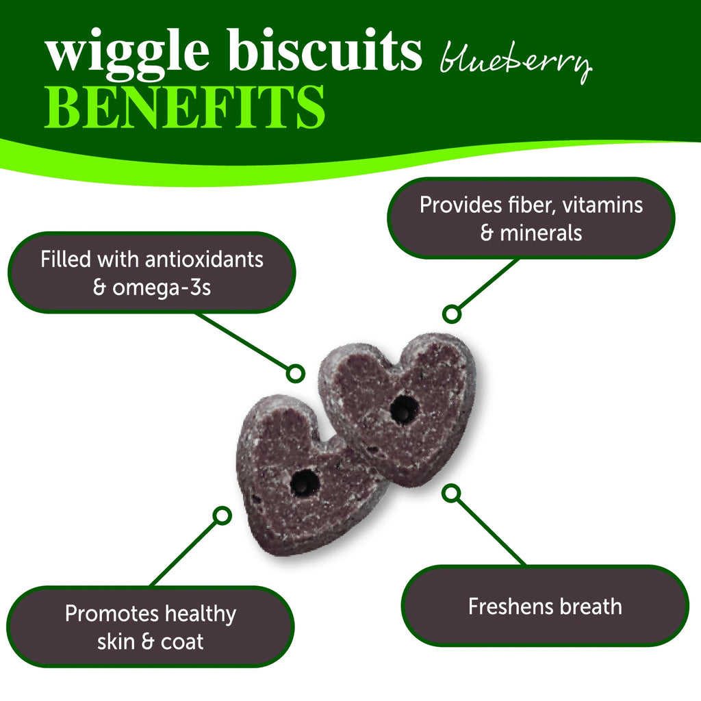 Packed with simple and healthy ingredients, our delicious blueberry wiggle biscuits brighten the days of countless pups with a satisfying flavor and a perfect crunch.